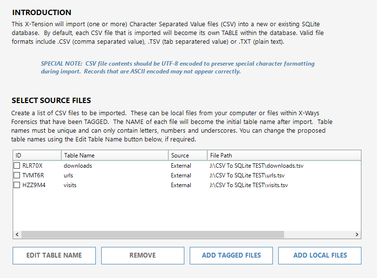 For each CSV file imported into the designated target database (new or existing), a new table is created in the target database. By default, the file name of the file being imported is what is used to name the new table as it is created inside the SQLite database. During the import process, examiners can choose to rename the intended table name to something more intuitive. CSV To SQLite uses this customization option to also prevent collisions in case files being imported from different directories happen to have the same file name.