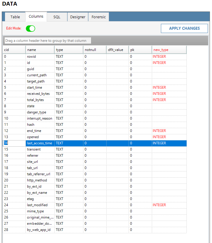 Once the data is imported, examiners can then modify the actual data type of select columns in the various tables created. Since all records imported default to a SQLite TEXT data type, it might be preferable to convert some columns to a more appropriate data type (e.g., from TEXT to INTEGER). This is achieved through an update to Exponent’s SQLite Explorer X-Tension where a new Edit Mode toggle switch has been created on the Columns tab.