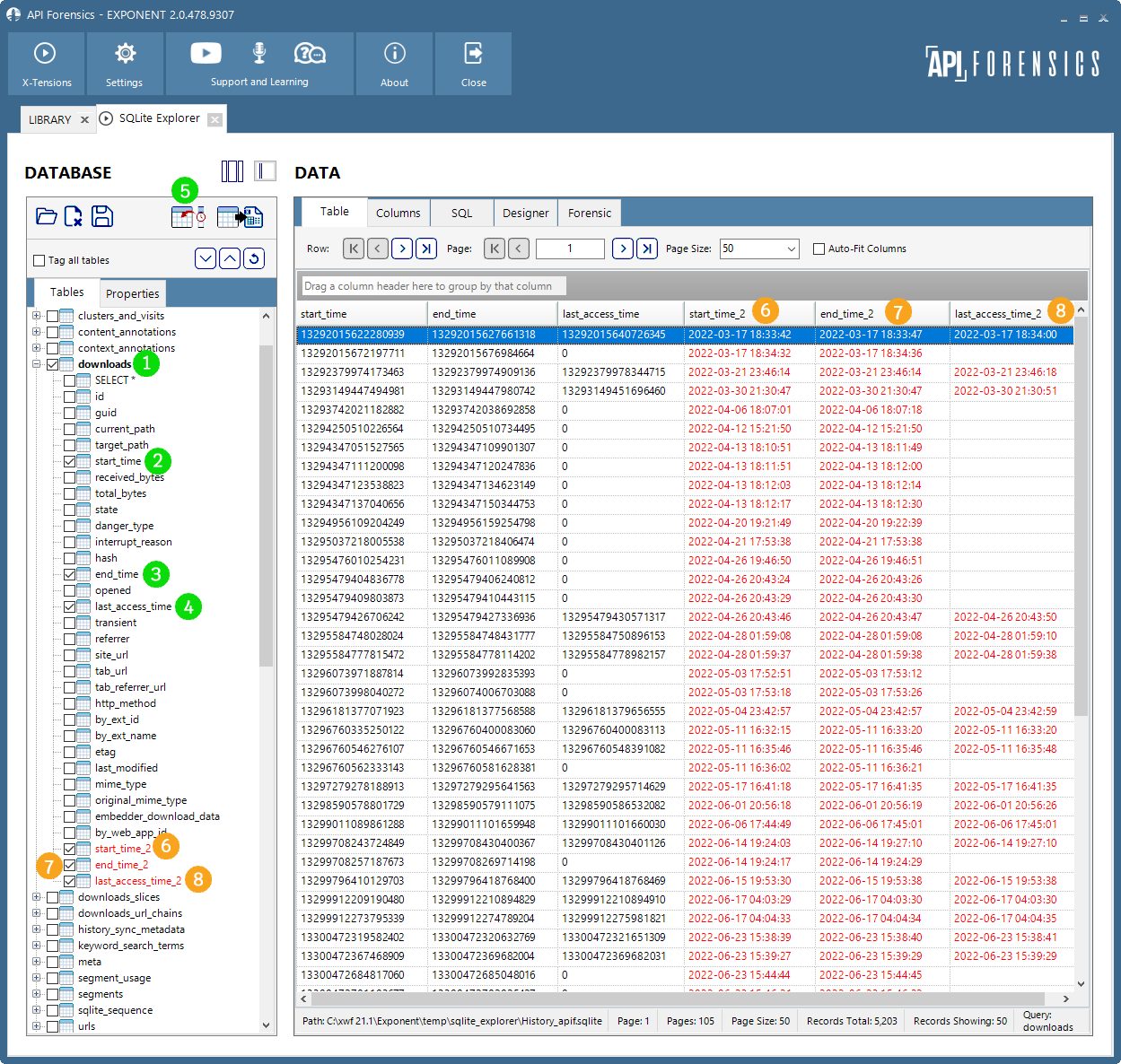 Once the data types have been updates to INTEGERs, Exponent SQLite Explorer can then convert those timestamp columns into new columns containing properly formatted dates and times. This makes it so much easier to then query date-based evidence.