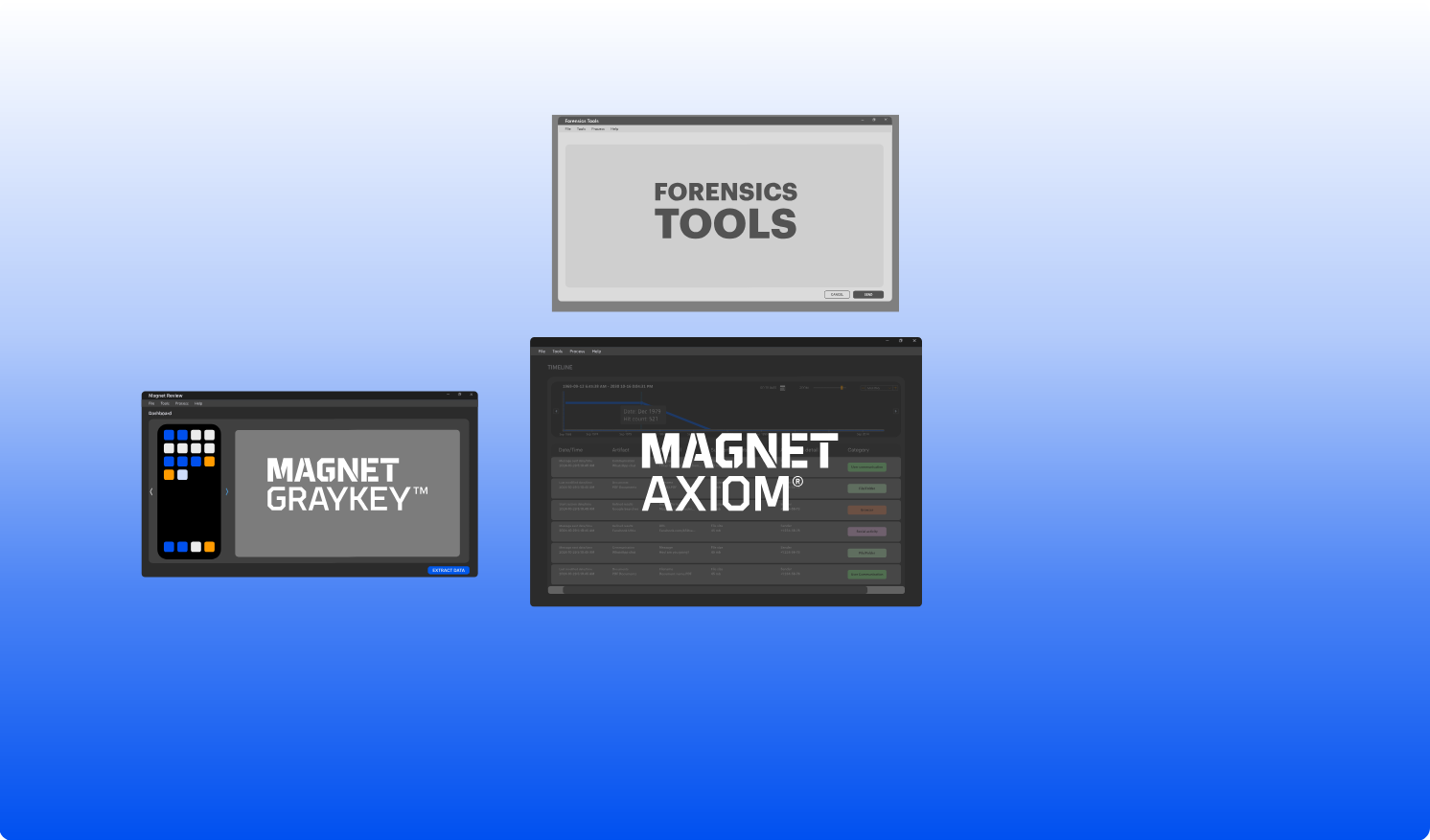 Unite Graykey with your other digital forensics solutions across your entire workflow for faster, more effective investigations. Magnet One effortlessly streamlines your workflows and enables seamless collaboration among examiners, investigators, prosecutors, command staff, and agency leadership.