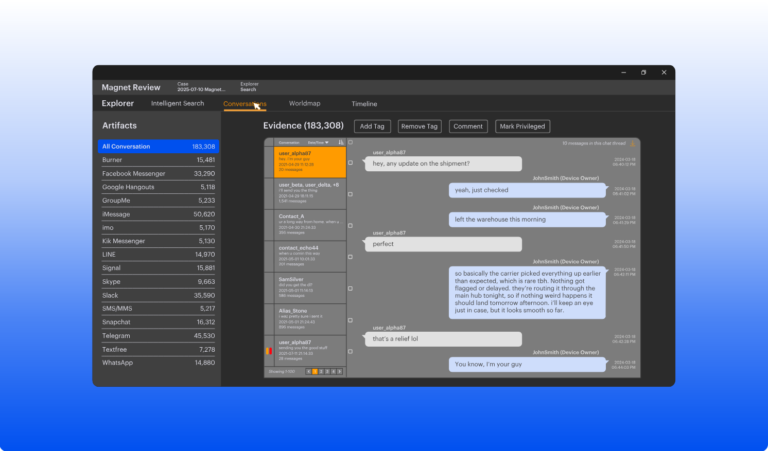 Visualize your evidence with easy-to-understand views like Artifacts, Conversations, Worldmap, and Timeline.
