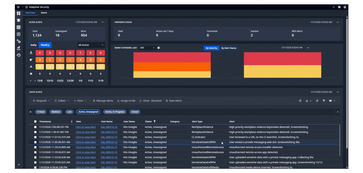 Detect and alert on high risk user behavior including sensitive data theft, misconduct, indicators of workplace violence, employment fraud, counterintelligence / counterterrorism indicators, and harassment. Actively monitor departing users, privileged users, and teams with access to sensitive data.